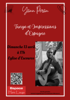 Récital Tango et impressions d'Espagne Publié le 06 mars 2025 / Dernière modification le 06 mars 2025 Récital Tango et impressions d'Espagne Récital Tango et impressions d'Espagne Publié le 06/03/2025 - Dernière modification le 06/03/2025 Le dimanche 13 avril 2025 de 17:00 à 19:00 Unique dans les Landes, venez nombreux! Un verre de l'amitié fera suite au récital.